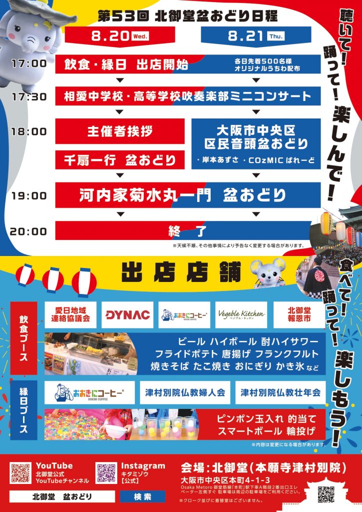 飲食やゲーム屋台はもちろん、両日ともに、河内家菊水丸さんによる河内音頭を披露。さらに今年は、北御堂と共同制作された「河内音頭 蓮如上人一代記より 浪華の黎明 大坂から大阪へ」が初公開されます。