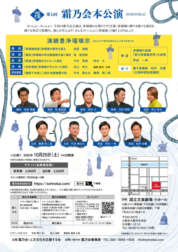 講談・浪曲・落語・文楽・能楽・茶道・華道の7ジャンル9人の上方伝統文化芸能ユニット「霜乃会」による、年1回の本公演。
