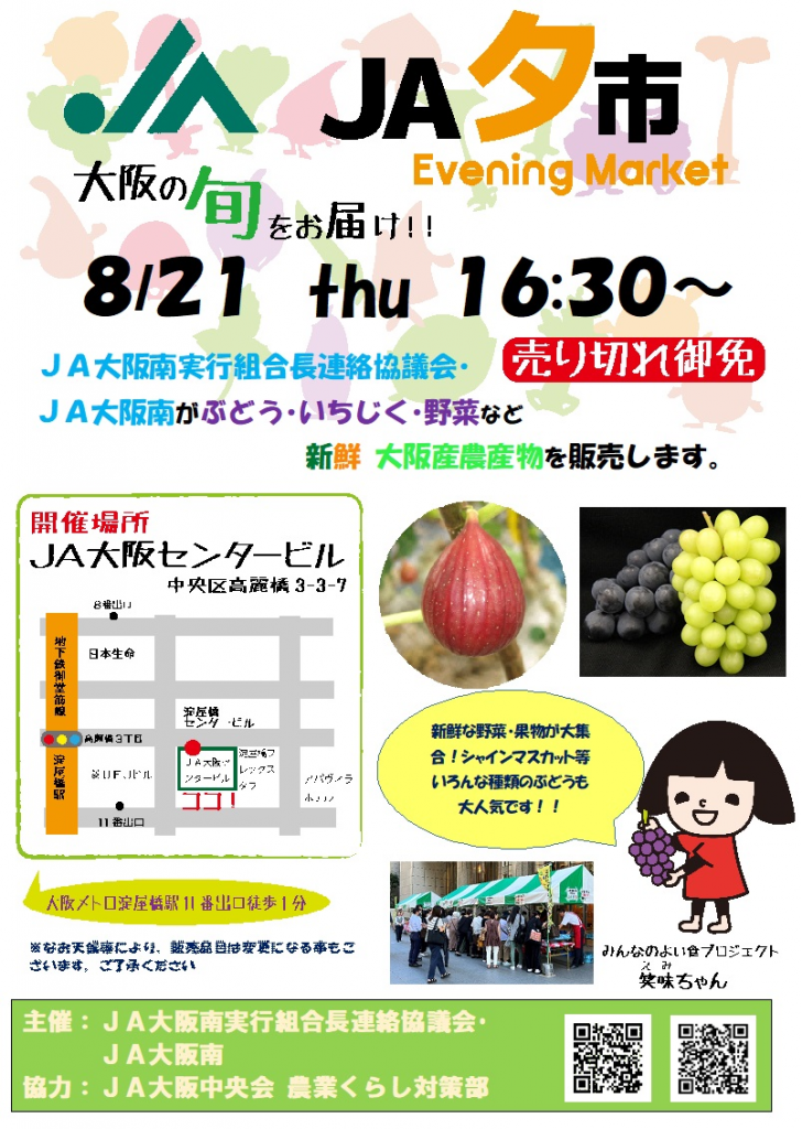 JA大阪中央会では、大阪農業の振興を目指し、府内農産物のPRとして、夕市(マルシェ)を行っています。今回は大阪南実行組合長連絡協議会・JA大阪南が、ぶどう・いちじく・なす等新鮮な大阪農産物を販売します。