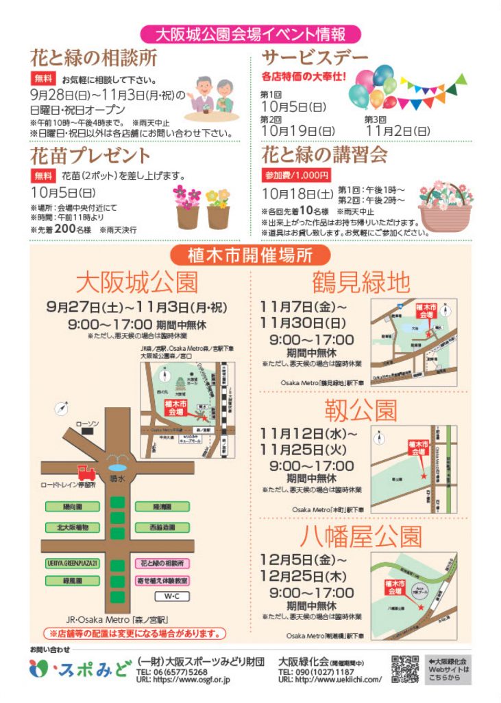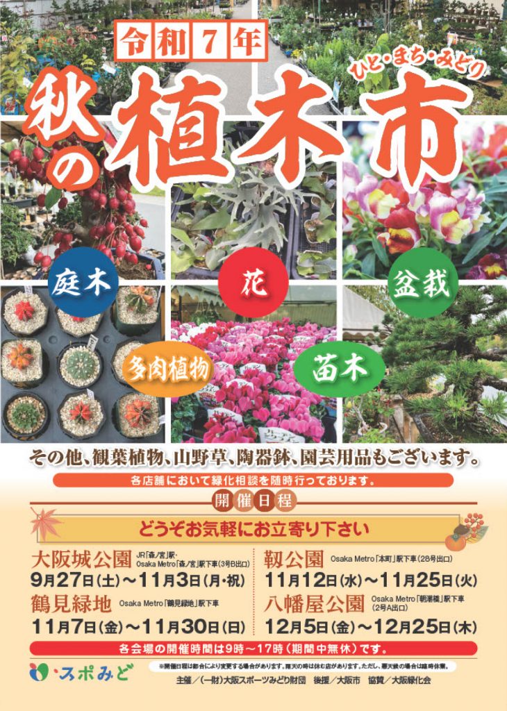 「秋の植木市」は、大阪城公園での開催に加え、11月7日からは鶴見緑地、11月12日からは靭公園、そして12月5日からは八幡屋公園でも順次開催されます。
