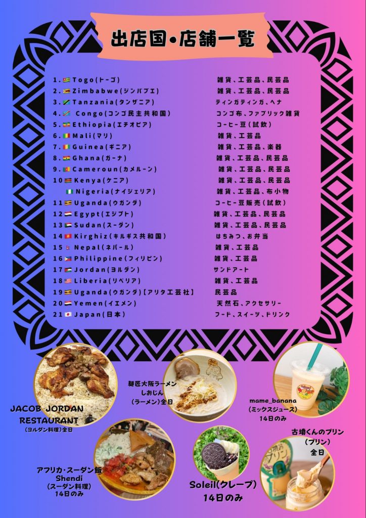 たくさんの国やお店が出店し、まるで小さな万博のような国際交流イベントが開催されます。