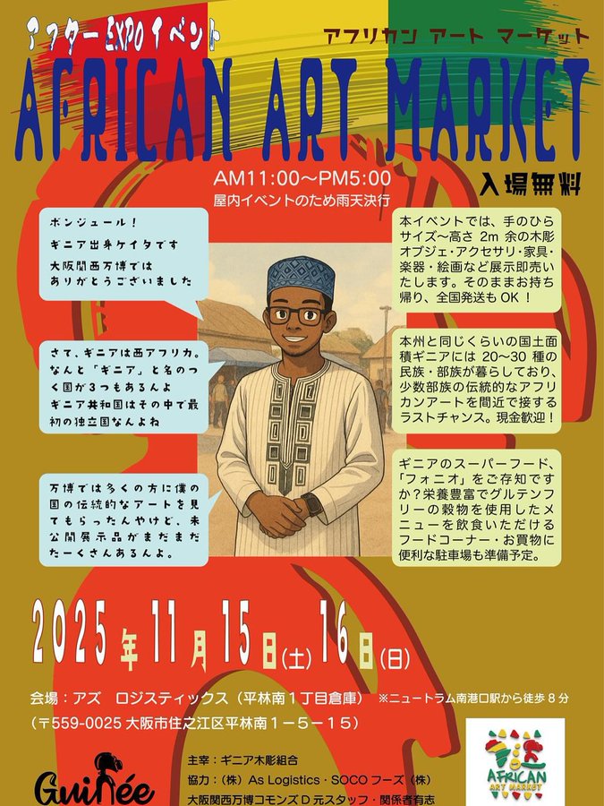イベントでは、西アフリカのギニア共和国をテーマに、手のひらサイズから2メートルを超える木彫オブジェや、アクセサリー、家具、楽器、絵画など、多彩なアフリカンアートが展示販売されます。その場で購入して持ち帰ることも可能で、全国発送にも対応しています。会場では、ギニアのスーパーフード「フォニオ」を使った料理や飲み物も味わうことができ、アフリカ文化の魅力を五感で体験できる内容となっています。