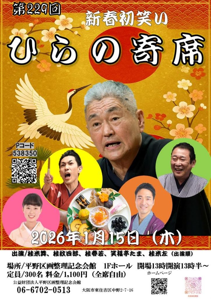 平野区画整理記念会館では、第229回ひらの寄席が1月15日に開催されます。