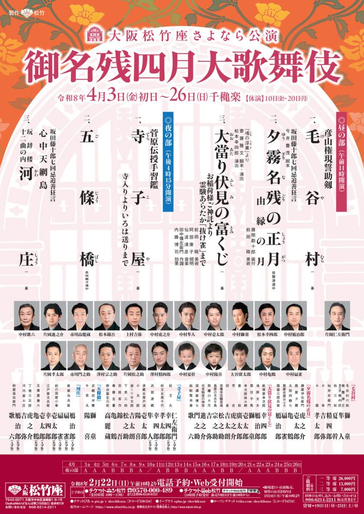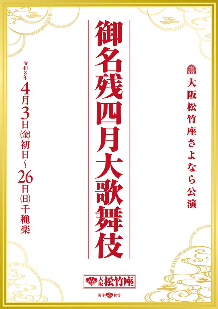 大阪松竹座は2026年5月に閉館することが発表されており、現在「大阪松竹座さよなら公演」として特別公演が行われています。来春4月には、その一環として「御名残四月大歌舞伎」が上演されます。