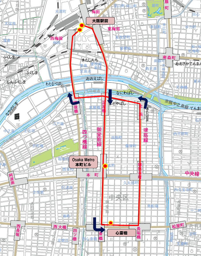 大阪駅前〜Osaka Metro本町ビル〜心斎橋〜大阪駅前(大阪市中央区・北区)
