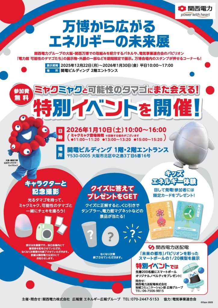 関西電力グループの大阪・関西万博での取組みを紹介するパネルや電気事業連合会のパビリオン「電力館 可能性のタマゴたち」の展示物・外膜の一部などを期間限定で展示されます。万博会場内のスタンプが押せるコーナーも置かれます。