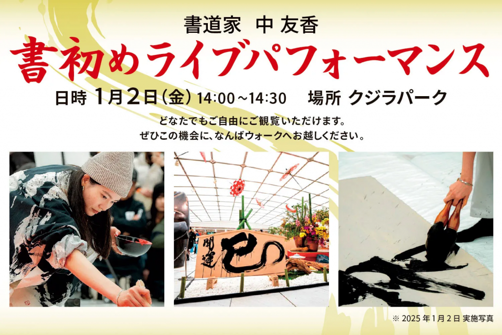 なんばウォーク・クジラパークでは、なんばウォーク初売りにあわせて「書初め書道ライブパフォーマンス」が開催されます。