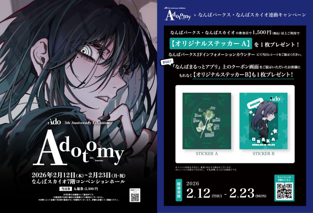大阪会場では、なんばパークス・なんばスカイオとの連動キャンペーンも実施され、期間中に対象の飲食店を利用するとオリジナルステッカーがもらえる特典も用意されています。この機会に、Adoの世界観をより深く感じられる特別な展示をぜひお楽しみください。