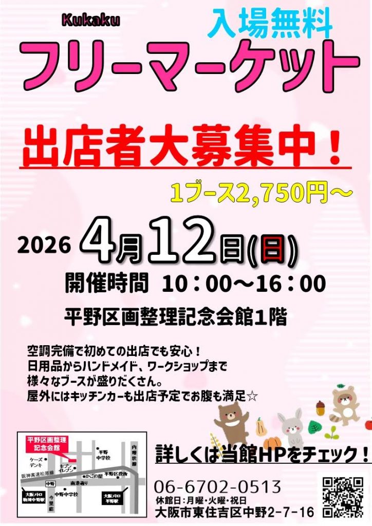 平野区画整理記念会館では、入場無料で楽しめる屋内フリーマーケットが開催されます。