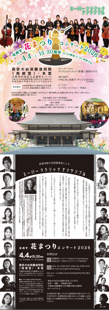 南御堂・花まつりコンサートは、お釈迦様の誕生を祝う「花まつり(灌仏会)」にあわせて2021年より開催されている音楽イベントです。