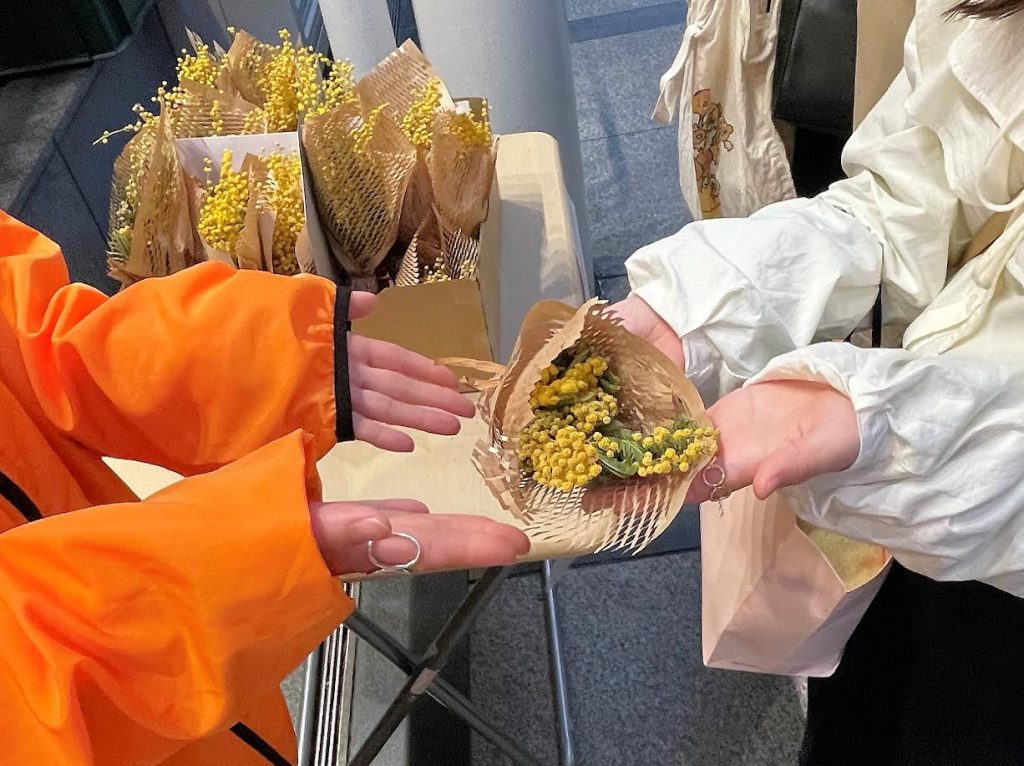 戎橋筋商店街では、感謝の気持ちとエールを送るとともに、女性が活躍する社会について考えてもらうきっかけづくりになればと、ミモザのミニブーケをプレゼントします!