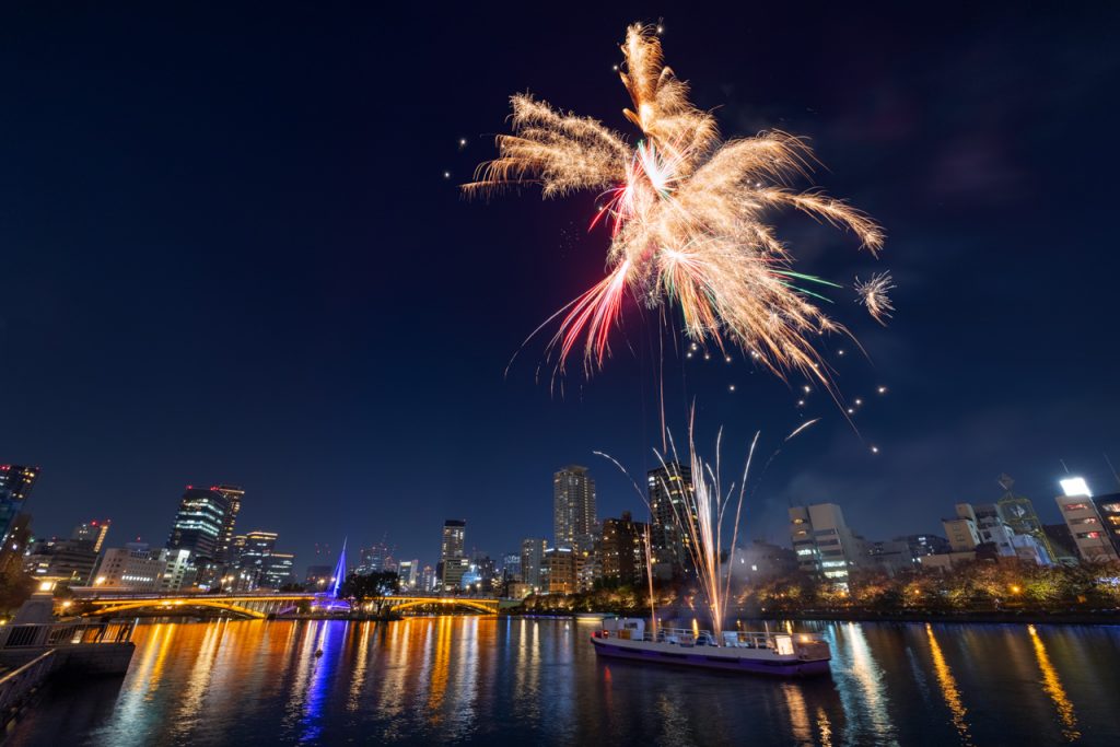 このイベントは、水都大阪の魅力発信と夜の観光コンテンツの充実を目的に実施されており、食事と花火を楽しめるクルーズプランも人気を集めています。なお、花火は大川左岸(南側)の八軒家浜遊歩道からも観覧することができます。