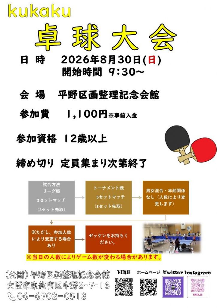 大阪市平野区にある平野区画整理記念会館では、卓球好きの方が気軽に参加できる「kukaku卓球大会」が開催されます。